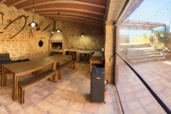 Sala comedor exterior equipada con mesas, sillas, bancos, cocina, barbacoa, parrilla, lata para caracoles, fogones y trébede ideal para paellas o fideuás, paellas distintos tamaños y nevera.